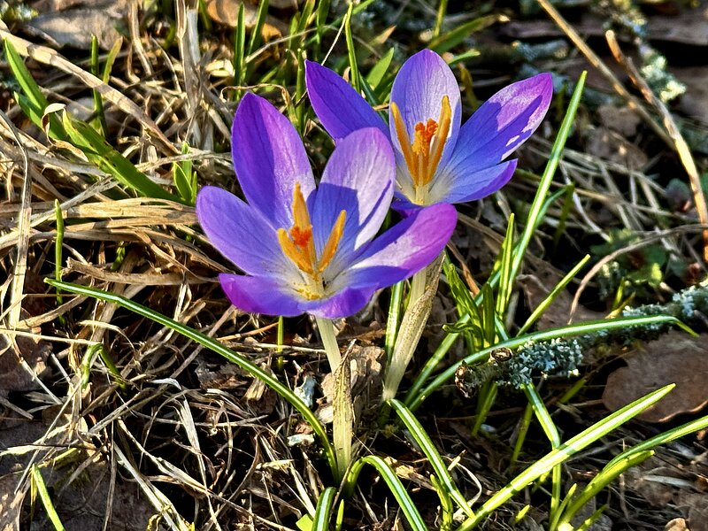 Der abgebildete Krokus ist ein Früh-Ling, ein voreiliger, versteckter Solitär. In einiger Zeit sind wilde Krokusse in der Nachbarschaft zum Botanischen Garten und der Blumenrondelle in Fläche zu bewundern. Blausterne (Scilla), Buschwindröschen (Anemone), Scharbockskraut (Ficaria verna) etc. werden sich dann auch zeigen -. und natürlich Bambergs "Hain-Gögerla", der Lerchensporn (Corydalis). - Hautflügler wie Wildbienen und Hummelköniginnen, zudem Schmetterlinge finden mit diesen Frühblühern ihre stärkende "schmackhafte Starthilfe".