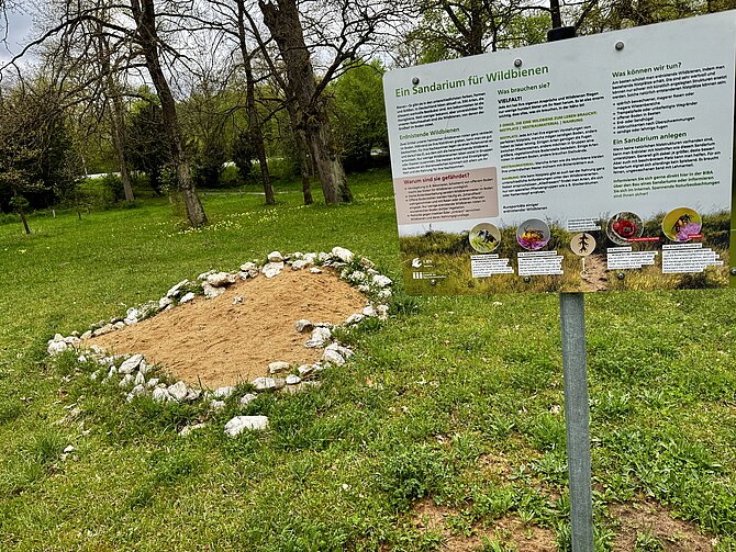 Ein "Sandarium" bietet den Wildbienen einen vegetationsfreien, sandigen Nistplatz an. Diese geschaffene Anlage ist eine Ergänzung zu dem sogenannten "Insektenhotel".